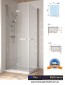 Mampara con puertas plegables y abatibles de vidrio.